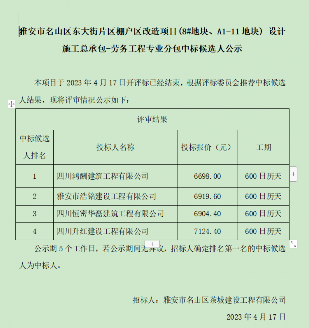 雅安市名山區(qū)東大街片區(qū)棚戶區(qū)改造項目(8#地塊、A1-11地塊) 設(shè)計施工總承包-勞務(wù)工程專業(yè)分包中標候選人公示